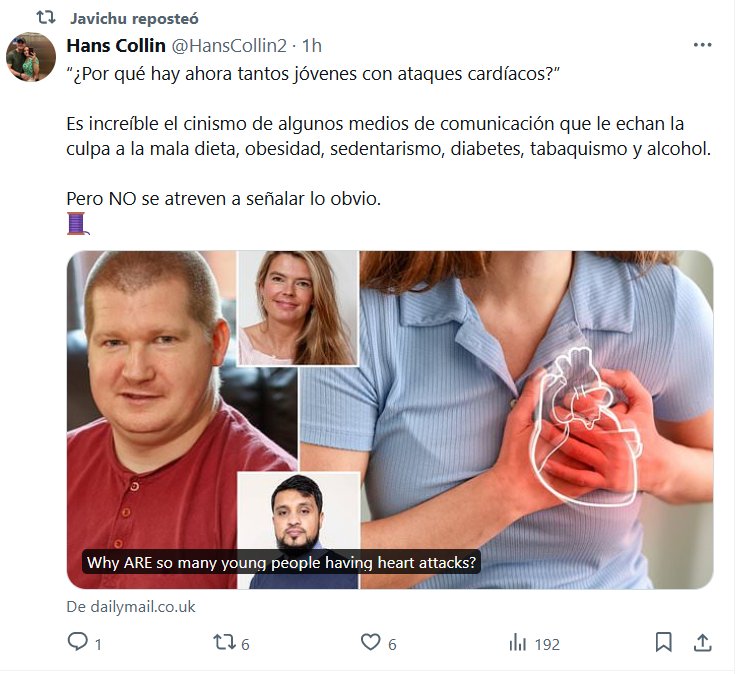 LA MMM (MAFIA MEDIÁTICA MUNDIAL) Y SU LEY DE OMERTÁ COVID “¿Por qué hay ahora tantos jóvenes con ataques cardíacos?” Es increíble el cinismo de algunos medios de comunicación que le echan la culpa a la mala dieta, obesidad, sedentarismo, diabetes, tabaquismo y alcohol. Pero NO se atreven a señalar lo obvio.