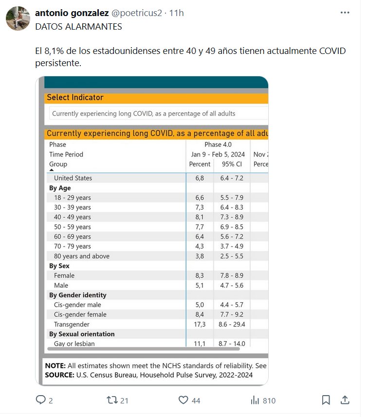 DATOS ALARMANTES El 8,1% de los estadounidenses entre 40 y 49 años tienen actualmente COVID persistente. Posted on marzo 6, 2024 por coronado