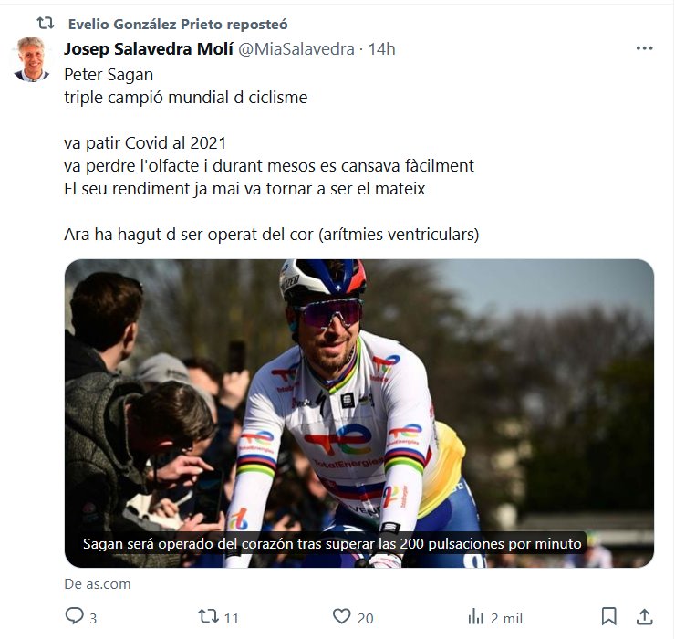 MENTÍAN QUE NO AFECTABA A JÓVENES SANOS (EN CATALÁN) Peter Sagan triple campeón mundial de ciclismo sufrió Covid en 2021 perdió el olfato y durante meses se cansaba fácilmente Su rendimiento ya nunca volvió a ser el mismo Ahora ha tenido que ser operado del corazón (arritmias ventriculares)