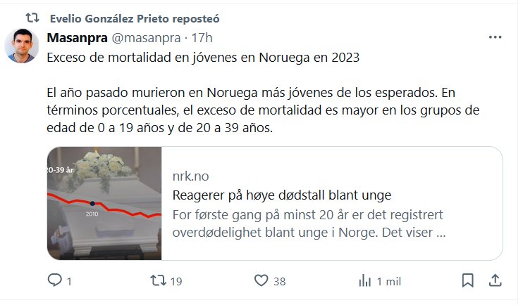 NODIGASCOVID Y POSTCOVID HACEN ESTRAGOS Exceso de mortalidad en jóvenes en Noruega en 2023 El año pasado murieron en Noruega más jóvenes de los esperados. En términos porcentuales, el exceso de mortalidad es mayor en los grupos de edad de 0 a 19 años y de 20 a 39 años