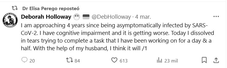TESTIMONIOS (EN INGLÉS) Me acerco a los 4 años desde que me infecté asintomáticamente por el SARS-CoV-2. Tengo deterioro cognitivo y está empeorando. Hoy me deshice en lágrimas tratando de completar una tarea en la que he estado trabajando durante un día y medio. Con la ayuda de mi marido, creo que lo lograré