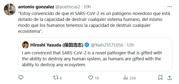 DE CUENTA X CERTIFICADA Hiroshi Yasuda (保田浩志) «Estoy convencido de que el SARS-CoV-2 es un patógeno novedoso que está dotado de la capacidad de destruir cualquier sistema humano, del mismo modo que los humanos tenemos la capacidad de destruir cualquier ecosistema»