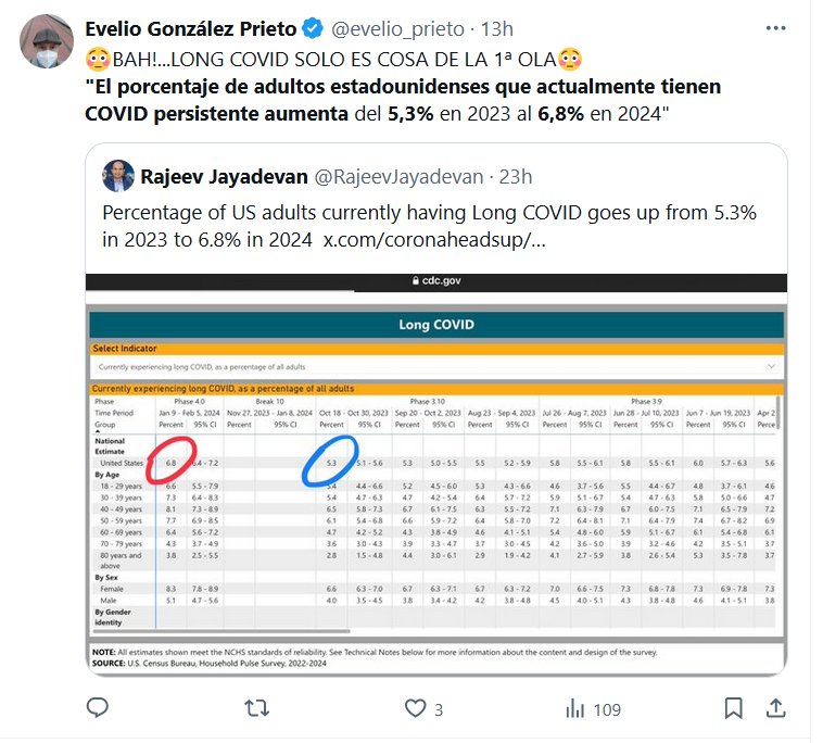 «El porcentaje de adultos estadounidenses que actualmente tienen COVID persistente aumenta del 5,3% en 2023 al 6,8% en 2024» Posted on marzo 7, 2024 por coronado