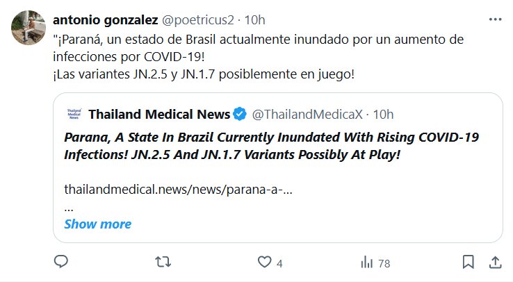 «¡Paraná, un estado de Brasil actualmente inundado por un aumento de infecciones por COVID-19! ¡Las variantes JN.2.5 y JN.1.7 posiblemente en juego! Posted on marzo 7, 2024 por coronado QUÉ PASA EN NUESTRO CONTINENTE SUDAMERICANO QUE NOS TENEMOS QUE ENTERAR POR MEDIOS TAILANDESES QUE ES LO QUE PASA EN BRASIL?
