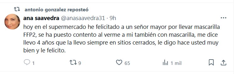 SOMOS POCOS PERO SANOS hoy en el supermercado he felicitado a un señor mayor por llevar mascarilla FFP2, se ha puesto contento al verme a mi también con mascarilla, me dice llevo 4 años que la llevo siempre en sitios cerrados, le digo hace usted muy bien y le felicito