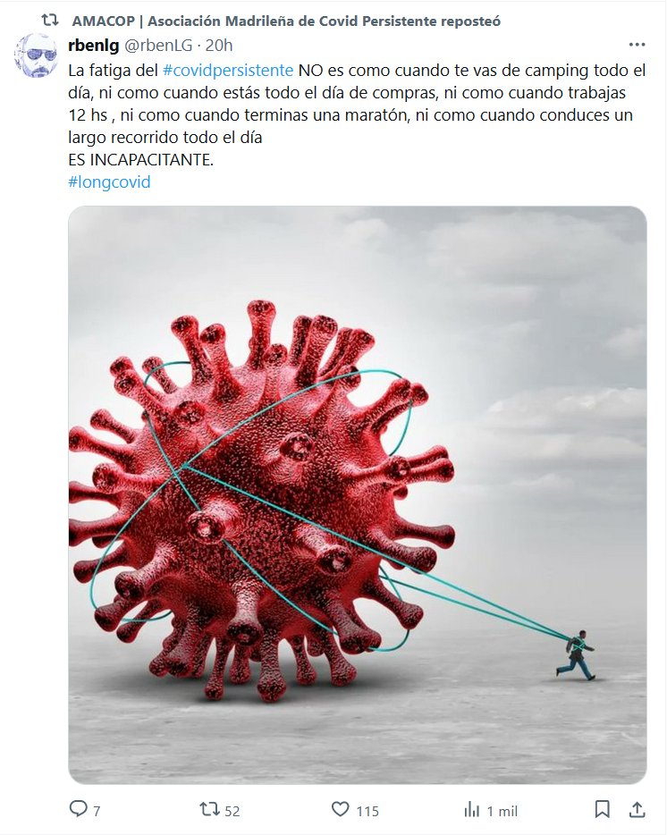 La fatiga del #covidpersistente NO es como cuando te vas de camping todo el día, ni como cuando estás todo el día de compras, ni como cuando trabajas 12 hs , ni como cuando terminas una maratón, ni como cuando conduces un largo recorrido todo el día ES INCAPACITANTE. #longcovid