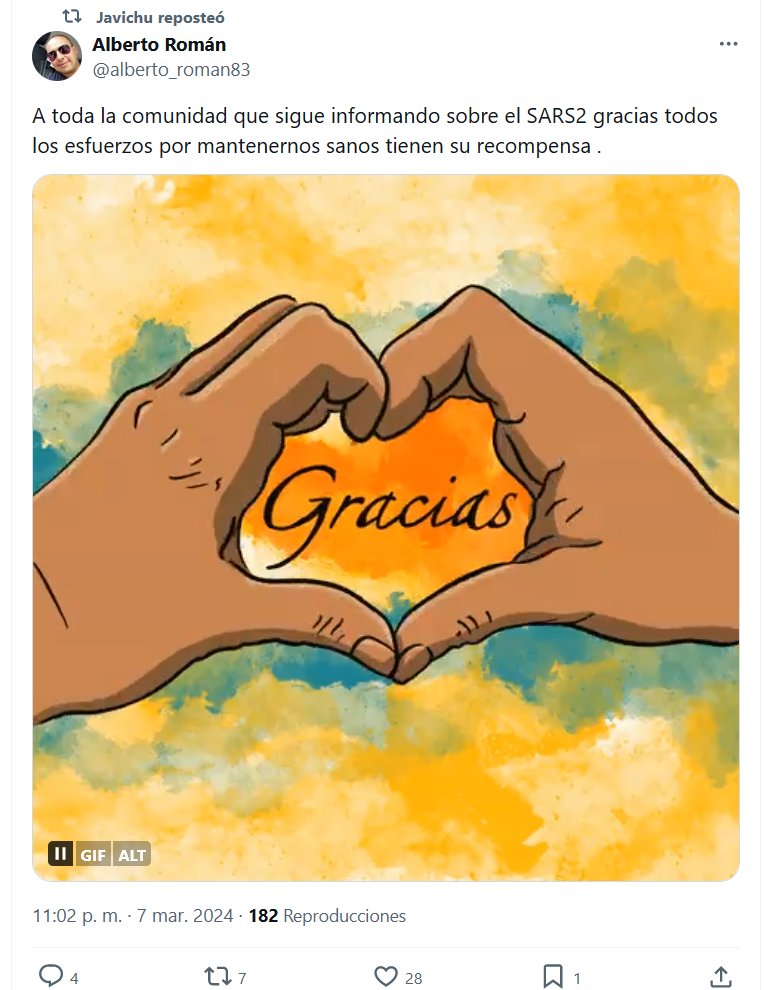 SOMOS POCOS PERO SOMOS BUENOS Javichu reposteó Alberto Román @alberto_roman83 A toda la comunidad que sigue informando sobre el SARS2 gracias todos los esfuerzos por mantenernos sanos tienen su recompensa .