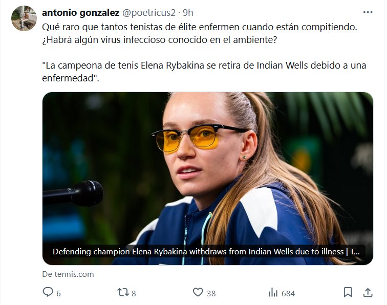BURLA COVID Qué raro que tantos tenistas de élite enfermen cuando están compitiendo.¿Habrá algún virus infeccioso conocido en el ambiente? «La campeona de tenis Elena Rybakina se retira de Indian Wells debido a una enfermedad»