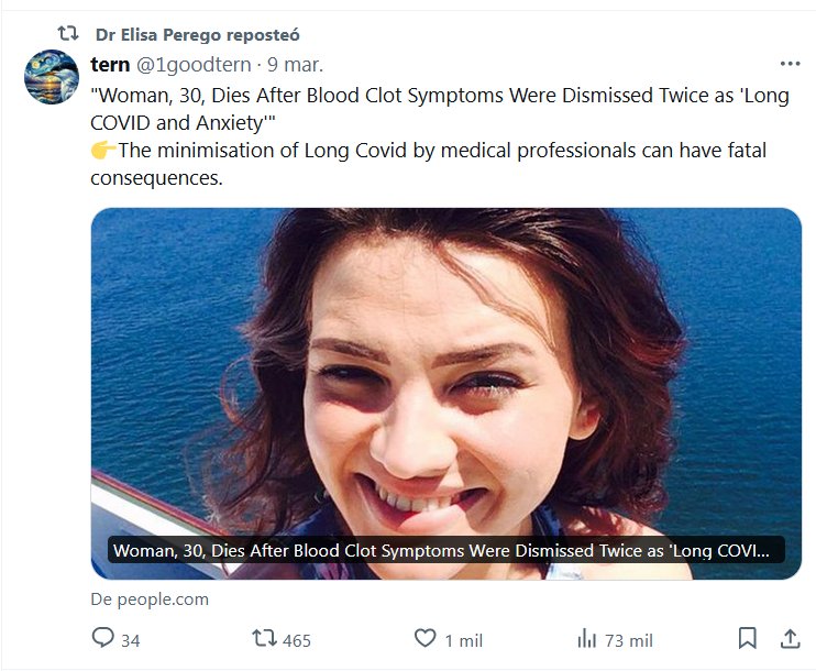 EN INGLÉS «Una mujer de 30 años muere después de que los síntomas de coágulos de sangre fueran descartados dos veces como ‘COVID prolongado y ansiedad'» 👉La minimización de Long Covid por parte de profesionales médicos puede tener consecuencias fatales