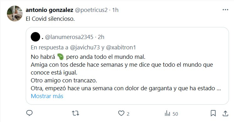 El Covid silencioso TESTIMONIOS No habrá 🦠 pero anda todo el mundo mal. Amiga con tos desde hace semanas y me dice que todo el mundo que conoce está igual. Otro amigo con trancazo. Otra, empezó hace una semana con dolor de garganta y que ha estado en cama toda la semana. Menudo plan 🤷🏻♀️