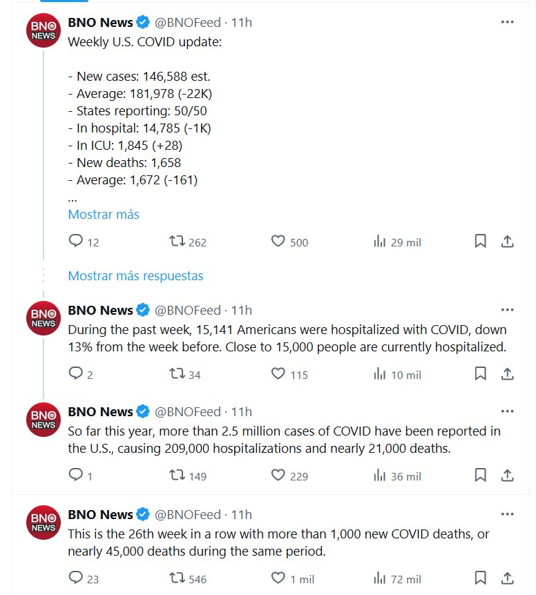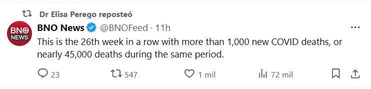 LA ÚNICA VERDAD SIGUE SIENDO LA REALIDAD (EN INGLÉS) «Esta es la vigésima sexta semana consecutiva con más de 1.000 nuevas muertes por COVID, o casi 45.000 muertes durante el mismo período» Posted on marzo 11, 2024 por coronado https://twitter.com/BNOFeed