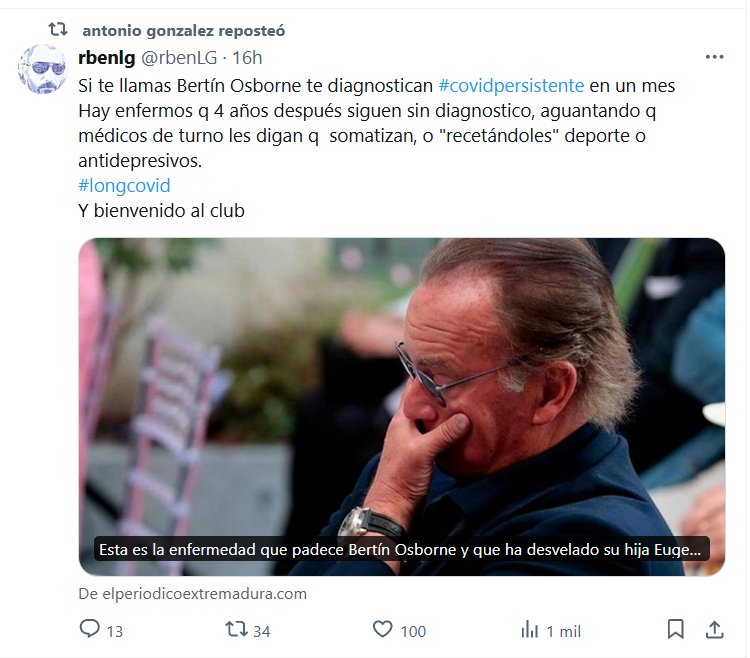 Si te llamas Bertín Osborne te diagnostican #covidpersistente en un mes Hay enfermos q 4 años después siguen sin diagnostico, aguantando q médicos de turno les digan q somatizan, o «recetándoles» deporte o antidepresivos. #longcovid Y bienvenido al club