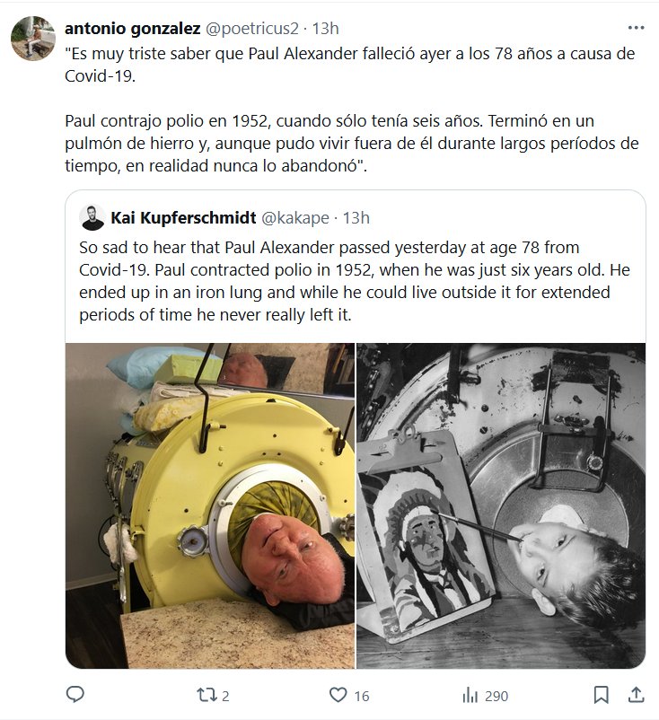 «Es muy triste saber que Paul Alexander falleció ayer a los 78 años a causa de Covid-19. Paul contrajo polio en 1952, cuando sólo tenía seis años. Terminó en un pulmón de hierro y, aunque pudo vivir fuera de él durante largos períodos de tiempo, en realidad nunca lo abandonó»