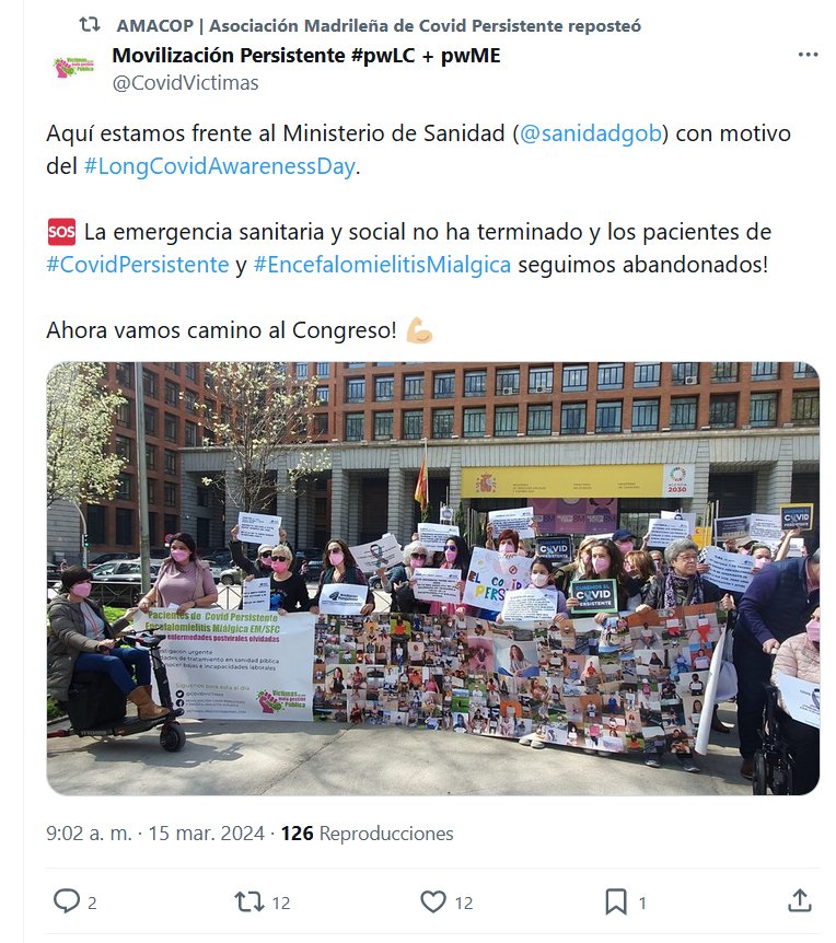 AMACOP | Asociación Madrileña de Covid Persistente reposteó Movilización Persistente #pwLC + pwME @CovidVictimas Aquí estamos frente al Ministerio de Sanidad (@sanidadgob ) con motivo del #LongCovidAwarenessDay. 🆘 La emergencia sanitaria y social no ha terminado y los pacientes de #CovidPersistente y #EncefalomielitisMialgica seguimos abandonados! Ahora vamos camino al Congreso! 💪🏼