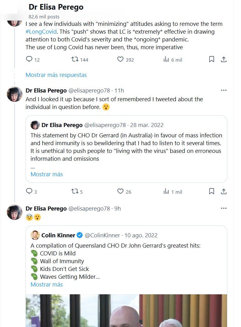 EN INGLÉS Dra. Elisa Perego @elisaperego78 Veo algunas personas con actitudes «minimizadoras» pidiendo que se elimine el término #LongCovid. Este «empuje» muestra que LC es *extremadamente* eficaz para llamar la atención tanto sobre la gravedad de Covid como sobre la pandemia *en curso*. El uso de Long Covid nunca ha sido, por tanto, más imperativo