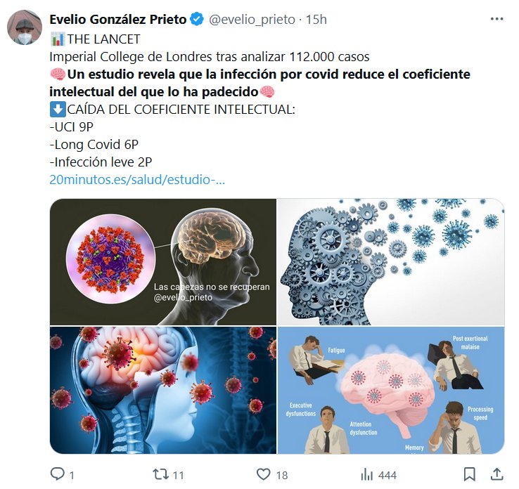 📊THE LANCET Imperial College de Londres tras analizar 112.000 casos 🧠Un estudio revela que la infección por covid reduce el coeficiente intelectual del que lo ha padecido🧠 ⬇️CAÍDA DEL COEFICIENTE INTELECTUAL: -UCI 9P -Long Covid 6P -Infección leve 2P