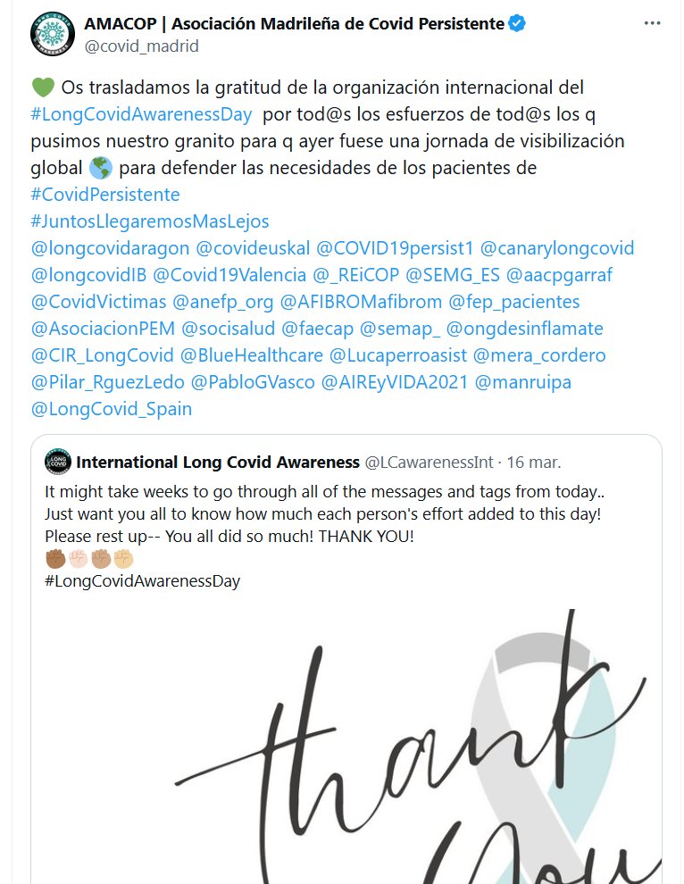 AMACOP | Asociación Madrileña de Covid Persistente @covid_madrid 💚 Os trasladamos la gratitud de la organización internacional del #LongCovidAwarenessDay por tod@s los esfuerzos de tod@s los q pusimos nuestro granito para q ayer fuese una jornada de visibilización global 🌎 para defender las necesidades de los pacientes de #CovidPersistente
