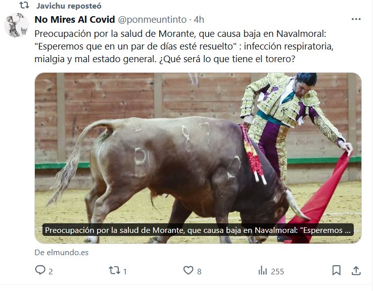 NODIGASCOVID: IRONÍA, SARCASMO, SORNA, BURLA, SOCARRONERÍA No Mires Al Covid @ponmeuntinto · Preocupación por la salud de Morante, que causa baja en Navalmoral: «Esperemos que en un par de días esté resuelto» : infección respiratoria, mialgia y mal estado general. ¿Qué será lo que tiene el torero?