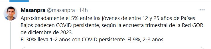 Aproximadamente el 5% entre los jóvenes de entre 12 y 25 años de Países Bajos padecen COVID persistente, según la encuesta trimestral de la Red GOR de diciembre de 2023. El 30% lleva 1-2 años con COVID persistente. El 9%, 2-3 años