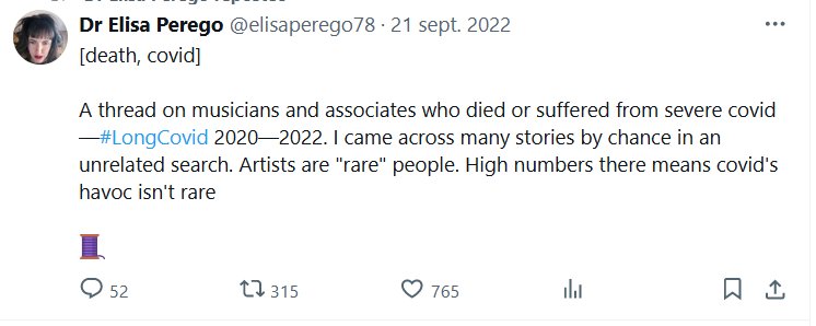 EN INGLÉS Un hilo sobre músicos y asociados que murieron o sufrieron de covid grave: #LongCovid 2020—2022. Encontré muchas historias por casualidad en una búsqueda no relacionada. Los artistas son personas «raras» (POCA CANTIDAD). Las cifras elevadas allí significan que los estragos del covid no son raros