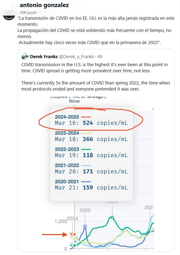 «La transmisión de C0VlD en los EE. UU. es la más alta jamás registrada en este momento. La propagación del C0VID se está volviendo más frecuente con el tiempo, no menos. Actualmente hay cinco veces más C0VlD que en la primavera de 2022»