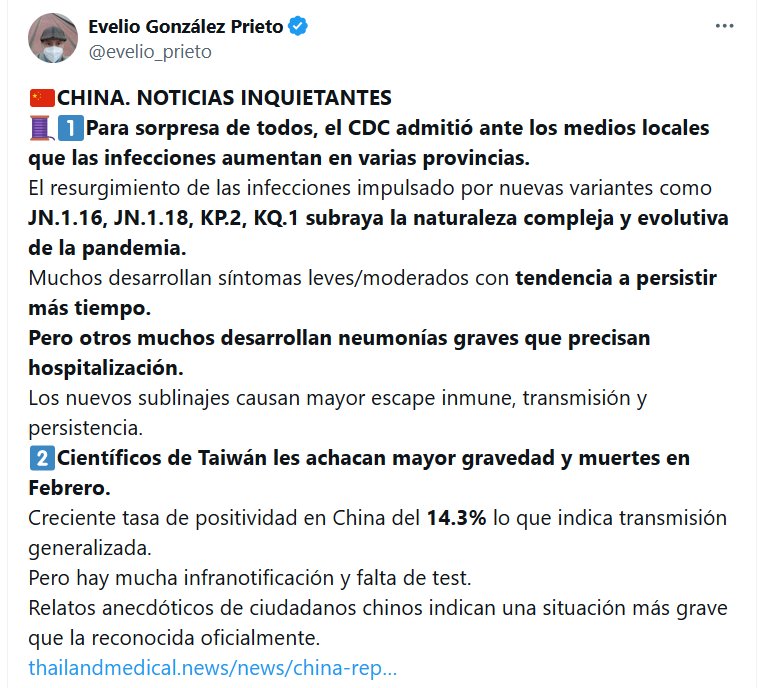 🇨🇳CHINA. NOTICIAS INQUIETANTES 🧵1⃣Para sorpresa de todos, el CDC admitió ante los medios locales que las infecciones aumentan en varias provincias. El resurgimiento de las infecciones impulsado por nuevas variantes como JN.1.16, JN.1.18, KP.2, KQ.1