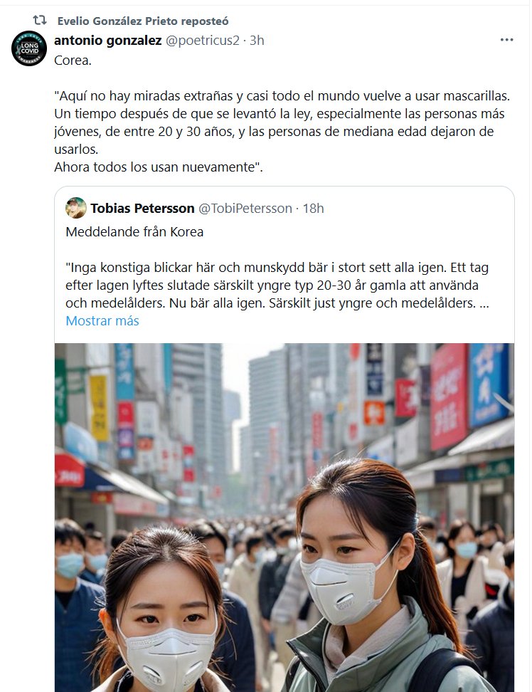 Corea. «Aquí no hay miradas extrañas y casi todo el mundo vuelve a usar mascarillas. Un tiempo después de que se levantó la ley, especialmente las personas más jóvenes, de entre 20 y 30 años, y las personas de mediana edad dejaron de usarlos. Ahora todos los usan nuevamente».