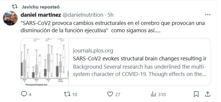 «SARS-CoV2 provoca cambios estructurales en el cerebro que provocan una disminución de la función ejecutiva» como sigamos así….. Posted on marzo 22, 2024 por coronado https://journals.plos.org/plosone/article?id=10.1371%2Fjournal.pone.0298837&utm_source=substack&utm_medium=email