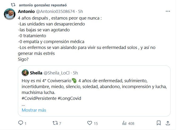 #CovidPersistente #LongCovid 4 años después , estamos peor que nunca : -Las unidades van desapareciendo -las bajas se van agotando -0 tratamiento -0 empatía y comprensión médica -Los enfermos se van aislando para vivir su enfermedad solos , y así no generar más estrés Sigo?