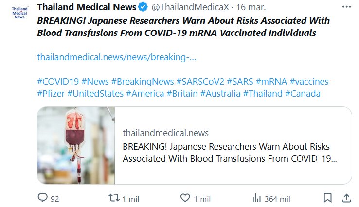 EN INGLÉS Investigadores japoneses advierten sobre los riesgos asociados con las transfusiones de sangre de personas vacunadas con ARNm contra la COVID-19 Posted on marzo 25, 2024 por coronado https://www.thailandmedical.news/news/breaking-japanese-researchers-warn-about-risks-associated-with-blood-transfusions-from-covid-19-mrna-vaccinated-individuals