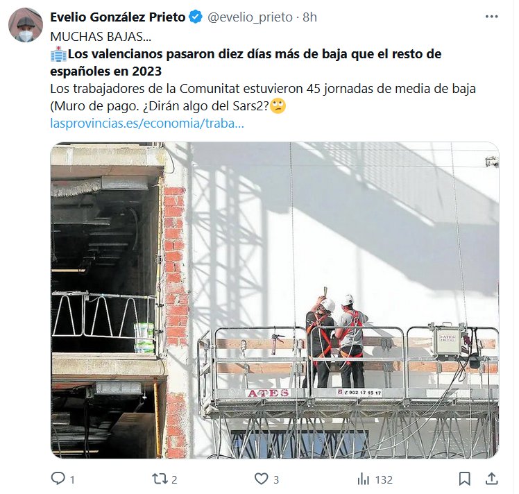 MUCHAS BAJAS… 🏥Los valencianos pasaron diez días más de baja que el resto de españoles en 2023 Los trabajadores de la Comunitat estuvieron 45 jornadas de media de baja (Muro de pago. ¿Dirán algo del Sars2?🙄