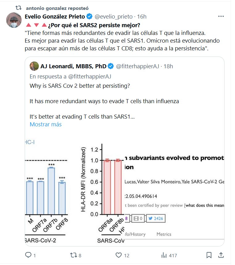 🔺🔻🔺¿Por qué el SARS2 persiste mejor? «Tiene formas más redundantes de evadir las células T que la influenza. Es mejor para evadir las células T que el SARS1. Omicron está evolucionando para escapar aún más de las células T CD8; esto ayuda a la persistencia»