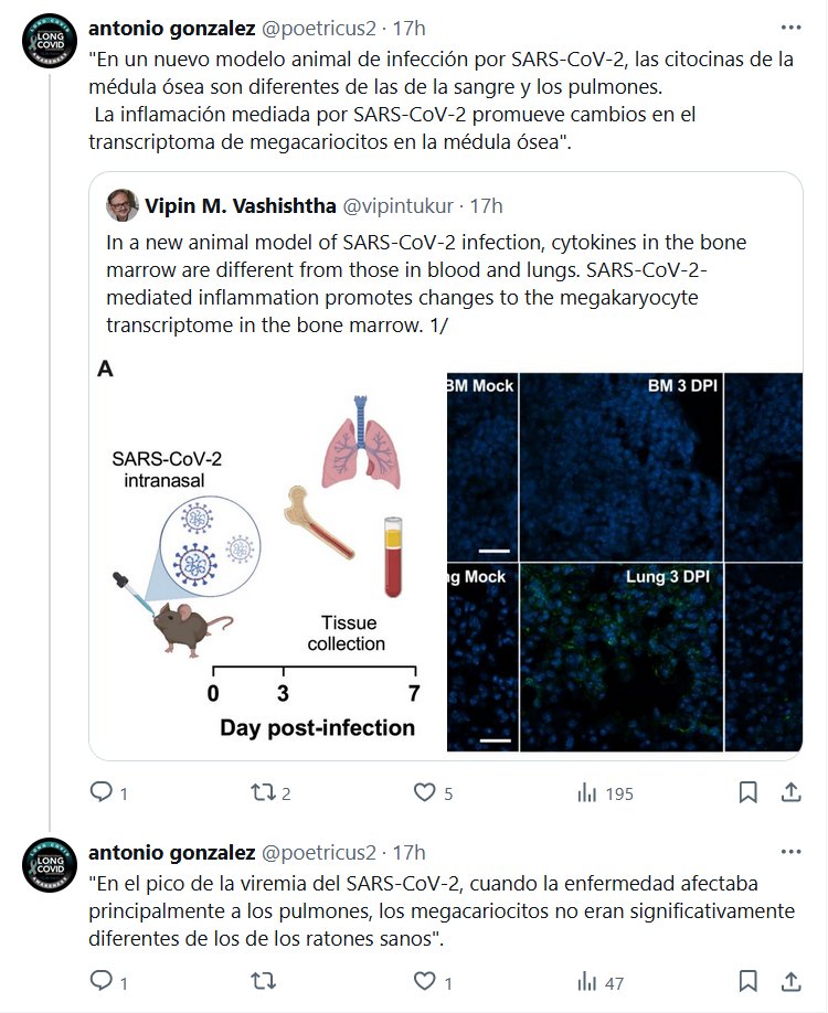 PARA ENTENDIDOS (GRAVÍSIMO) «En un nuevo modelo animal de infección por SARS-CoV-2, las citocinas de la médula ósea son diferentes de las de la sangre y los pulmones. La inflamación mediada por SARS-CoV-2 promueve cambios en el transcriptoma de megacariocitos en la médula ósea»