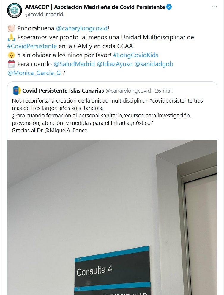 AMACOP | Asociación Madrileña de Covid Persistente @covid_madrid 👏🏻 Enhorabuena @canarylongcovid ! 🙏 Esperamos ver pronto al menos una Unidad Multidisciplinar de #CovidPersistente en la CAM y en cada CCAA! 👶 Y sin olvidar a los niños por favor! #LongCovidKids 🗓 Para cuando @SaludMadrid @IdiazAyuso @sanidadgob @Monica_Garcia_G ?