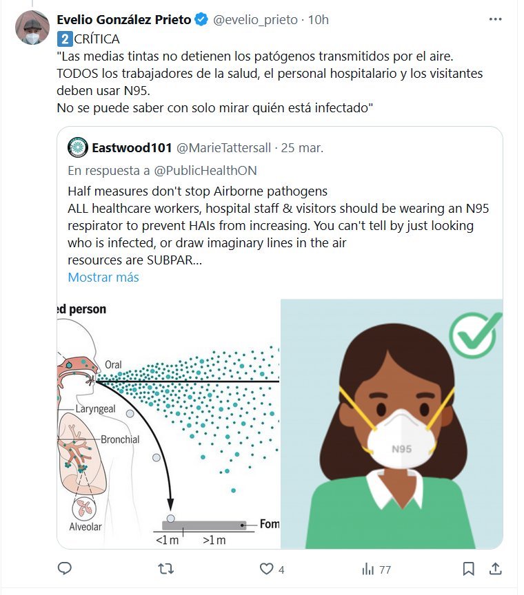 CRÍTICA «Las medias tintas no detienen los patógenos transmitidos por el aire. TODOS los trabajadores de la salud, el personal hospitalario y los visitantes deben usar N95. No se puede saber con solo mirar quién está infectado»