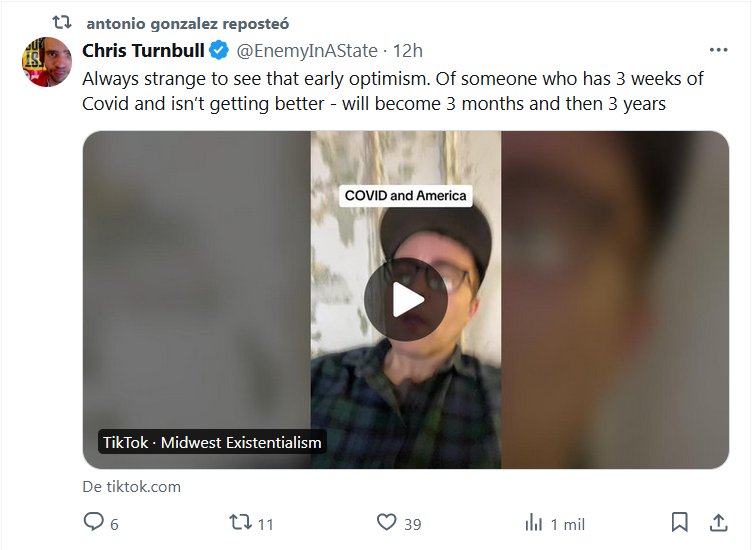 EN INGLÉS Siempre es extraño ver ese optimismo inicial. De alguien que tiene 3 semanas de Covid y no mejora – pasarán a ser 3 meses y luego 3 años Posted on marzo 27, 2024 por coronado https://www.tiktok.com/@brendonfreakinglemon/video/7349305010146086186?_r=1&_t=8l0rvyMXuNM