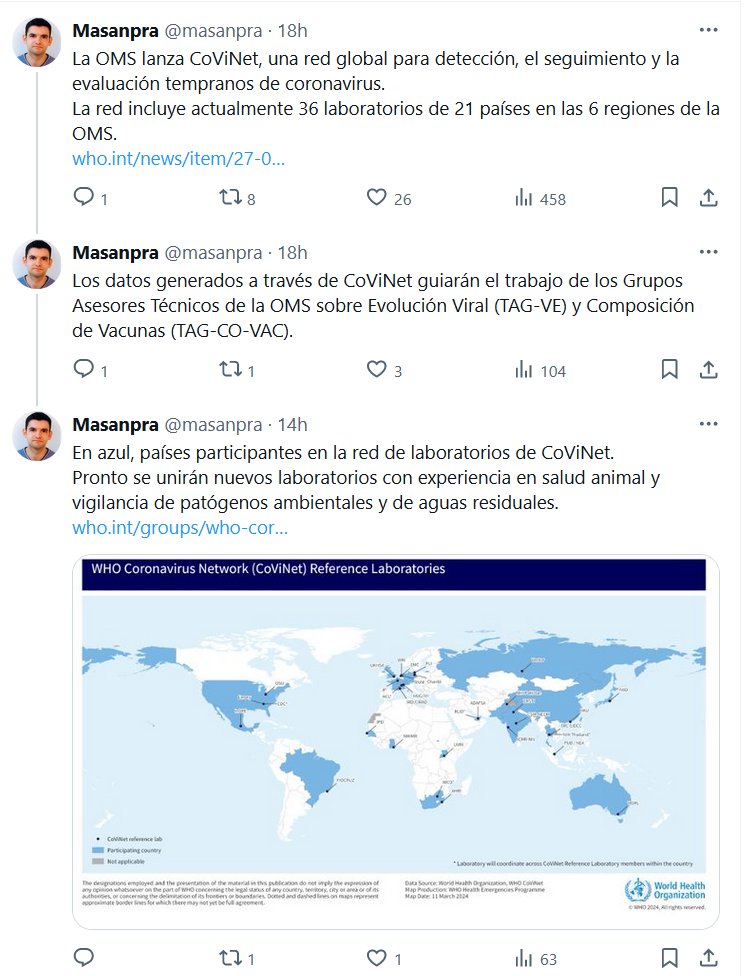 La OMS lanza CoViNet, una red global para detección, el seguimiento y la evaluación tempranos de coronavirus. La red incluye actualmente 36 laboratorios de 21 países en las 6 regiones de la OMS.
