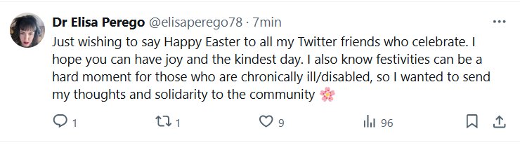 BLESSINGS TO YOU! (EN INGLÉS) Dra. Elisa Perego @elisaperego78 · Sólo deseo decir Felices Pascuas a todos mis amigos de Twitter que celebran. Espero que puedas tener alegría y el mejor día. También sé que las festividades pueden ser un momento difícil para quienes padecen enfermedades crónicas o discapacitados, así que quería enviar mis pensamientos y solidaridad a la comunidad 🌸
