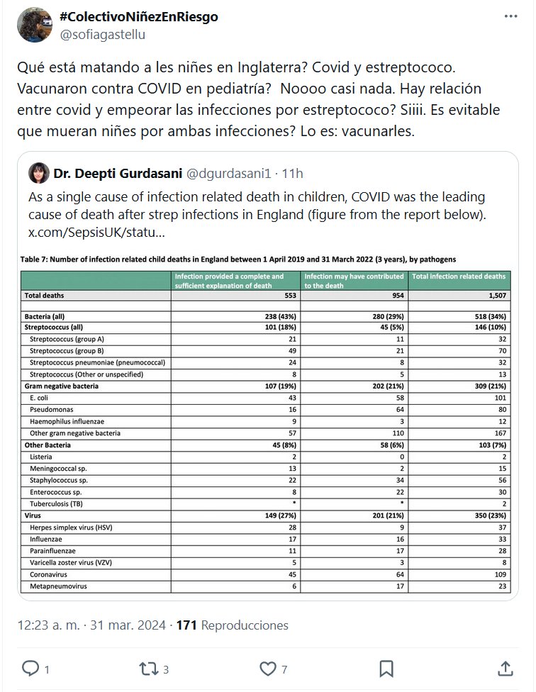 #ColectivoNiñezEnRiesgo @sofiagastellu Qué está matando a les niñes en Inglaterra? Covid y estreptococo. Vacunaron contra COVID en pediatría? Noooo casi nada. Hay relación entre covid y empeorar las infecciones por estreptococo? Siiii. Es evitable que mueran niñes por ambas infecciones? Lo es: vacunarles.