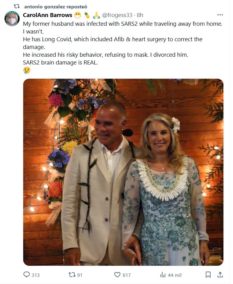 TESTIMONIOS (EN INGLÉS) CarolAnn Barrows 😷 🍍 🙏 @frogess33 Mi exmarido se infectó con SARS2 mientras viajaba fuera de casa. Yo no lo estaba. Tiene Long Covid, que incluyó Afib y cirugía cardíaca para corregir el daño. Incrementó su comportamiento de riesgo, negándose a usar mascarilla. Me divorcié de él. El daño cerebral del SARS2 es REAL. 😢