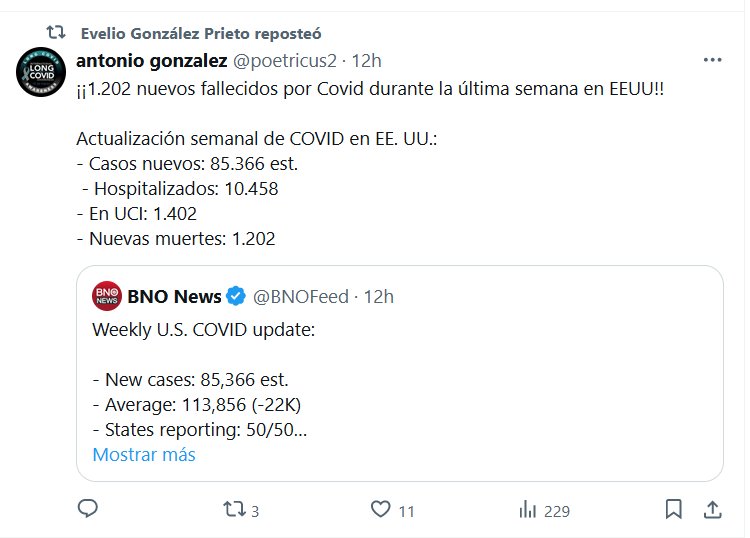 172 MUERTES COVID POR DÍA, 7 POR HORA! ¡¡1.202 nuevos fallecidos por Covid durante la última semana en EEUU!! Actualización semanal de COVID en EE. UU.: – Casos nuevos: 85.366 est. – Hospitalizados: 10.458 – En UCI: 1.402 – Nuevas muertes: 1.202