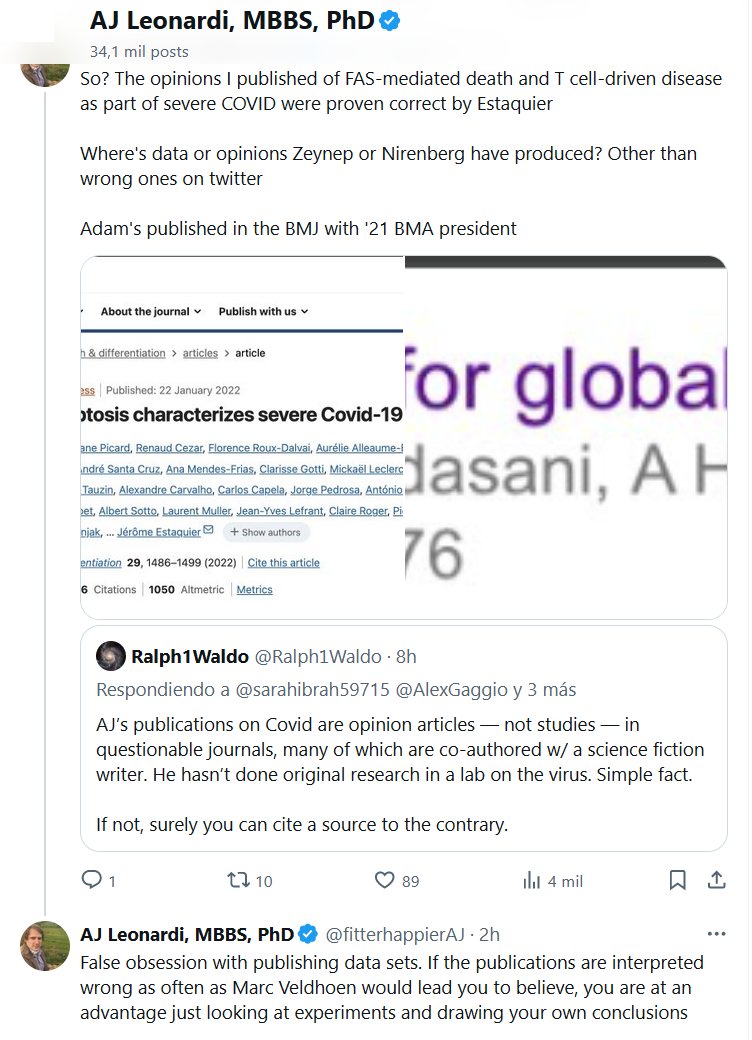 EN INGLÉS AJ Leonardi, MBBS, PhD @fitterhappierAJ Estaquier demostró que las opiniones que publiqué sobre la muerte mediada por FAS y la enfermedad impulsada por células T como parte del COVID grave eran correctas.