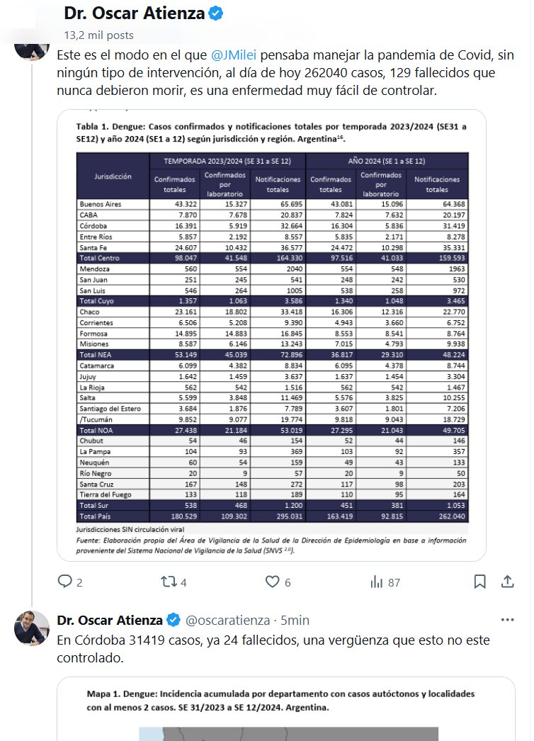 HOY DENGUE, SI AYER HUBIERA ESTADO MILEI LE GANABA A BOLSONARO Dr. Oscar Atienza @oscaratienza · Este es el modo en el que @JMilei pensaba manejar la pandemia de Covid, sin ningún tipo de intervención, al día de hoy 262040 casos, 129 fallecidos que nunca debieron morir, es una enfermedad muy fácil de controlar.