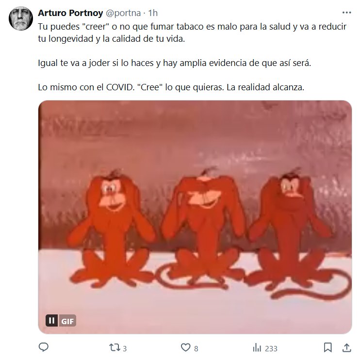 Tu puedes «creer» o no que fumar tabaco es malo para la salud y va a reducir tu longevidad y la calidad de tu vida. Igual te va a joder si lo haces y hay amplia evidencia de que así será. Lo mismo con el COVID. «Cree» lo que quieras. La realidad alcanza.