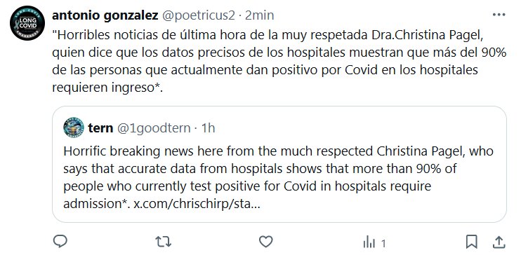 «Horribles noticias de última hora de la muy respetada Dra.Christina Pagel, quien dice que los datos precisos de los hospitales muestran que más del 90% de las personas que actualmente dan positivo por Covid en los hospitales requieren ingreso*