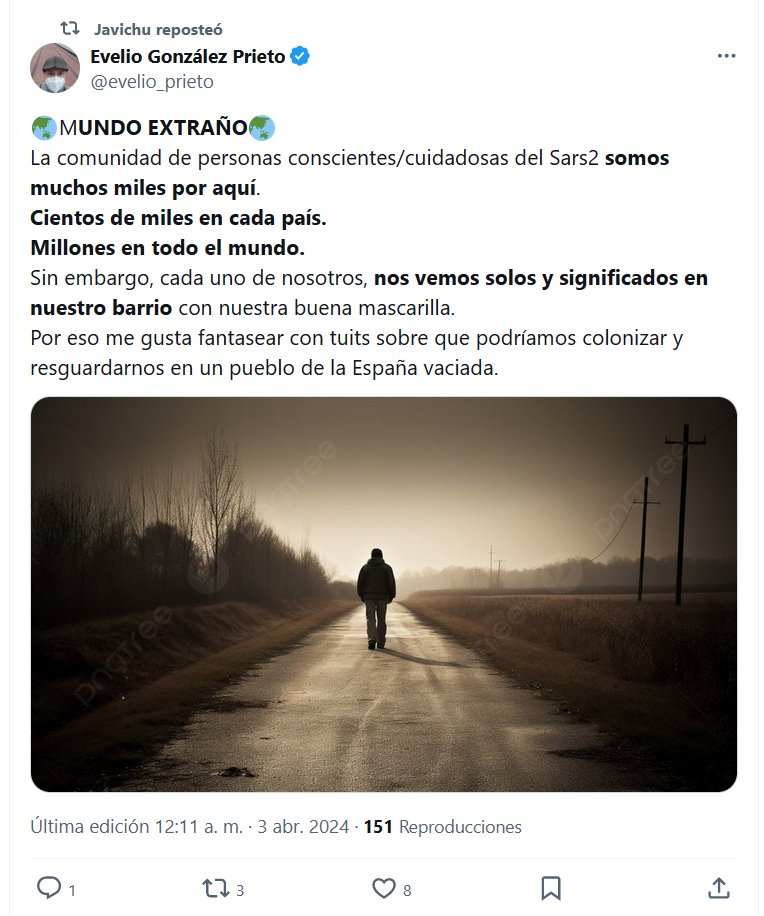 FILOSOFÍA Y HUMOR EN PANDEMIA 🌏MUNDO EXTRAÑO🌏 La comunidad de personas conscientes/cuidadosas del Sars2 somos muchos miles por aquí. Cientos de miles en cada país. Millones en todo el mundo. Sin embargo, cada uno de nosotros, nos vemos solos y significados en nuestro barrio con nuestra buena mascarilla. Por eso me gusta fantasear con tuits sobre que podríamos colonizar y resguardarnos en un pueblo de la España vaciada.