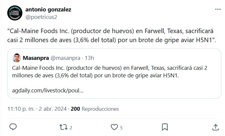 MÁS PLAGAS BÍBLICAS «Cal-Maine Foods Inc. (productor de huevos) en Farwell, Texas, sacrificará casi 2 millones de aves (3,6% del total) por un brote de gripe aviar H5N1» Posted on abril 3, 2024 por coronado