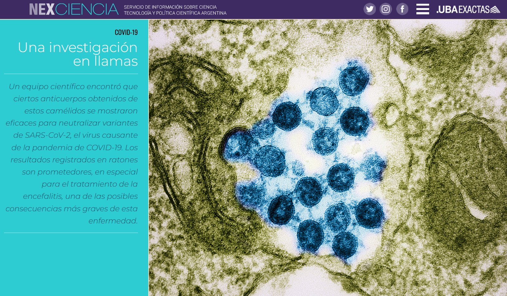Un equipo científico encontró que ciertos anticuerpos obtenidos de estos camélidos se mostraron eficaces para neutralizar variantes de SARS-CoV-2, el virus causante de la pandemia de COVID-19. Los resultados registrados en ratones son prometedores, en especial para el tratamiento de la encefalitis, una de las posibles consecuencias más graves de esta enfermedad.