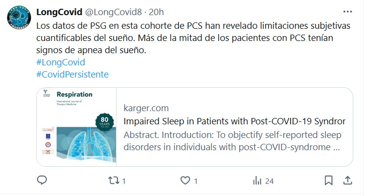 EN INGLÉS Deterioro del sueño en pacientes con síndrome post-COVID-19 en comparación con controles sanos: un ensayo transversal Posted on abril 5, 2024 por coronado https://karger.com/res/article/103/4/177/896169/Impaired-Sleep-in-Patients-with-Post-COVID-19
