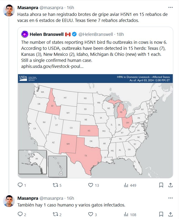PARAPANDEMIA-SS: VIRUS EN LA LECHE Y SU PASTEURIZACIÓN Hasta ahora se han registrado brotes de gripe aviar H5N1 en 15 rebaños de vacas en 6 estados de EEUU. Texas tiene 7 rebaños afectados. Posted on abril 5, 2024 por coronado https://www.betterhealth.vic.gov.au/health/conditionsandtreatments/bird-flu-avian-influenza